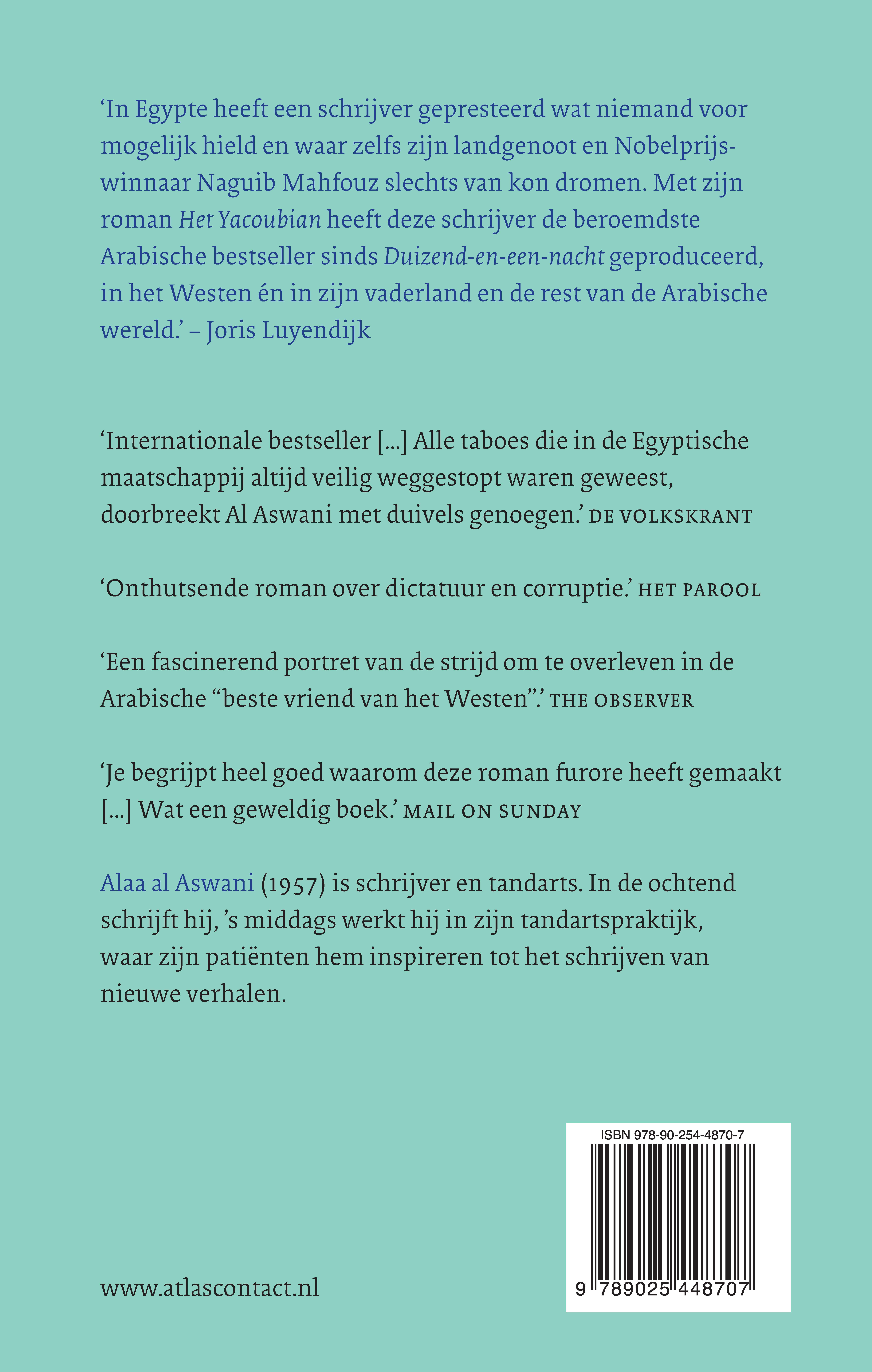 Alaa al Aswani laat ons kennismaken met de bewoners van het Yacoubiangebouw in Cairo. Van de vrome portierszoon tot de nietsontziende zakenman wiens winkels zich op de begane grond bevinden. En van de armoedzaaiers van de kamertjes op het dak tot en met de bewoners van de grote appartementen, zoals de homoseksuele intellectueel en de nouveau riche die een parlementszetel koopt. Alaa al Aswani observeert zijn personages en hun zwaktes met veel liefde en mededogen, en dat spat van de pagina’s af. Hij weet individuele verhalen meesterlijk te vertellen en aaneen te smeden tot een fascinerende roman. Deze roman, even betoverend als controversieel, veroorzaakte uitzonderlijke beroering bij het verschijnen in de Arabische wereld.