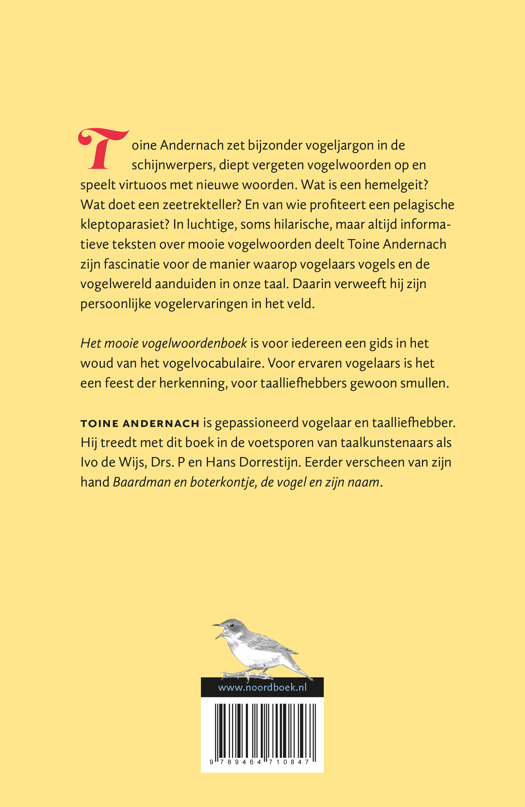Toine Andernach zet bijzonder vogeljargon in de schijnwerpers, vergeten vogelwoorden maar ook nieuwe woorden. In het voetspoor van taalkunstenaars als Ivo de Wijs, Drs. P en Hans Dorrestijn, deelt hij hun liefde voor de natuur en speelt virtuoos met taal.